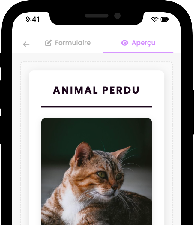 Créez une affiche en 2 clics après avoir signalé votre animal et augmentez vos chances de le retrouver.