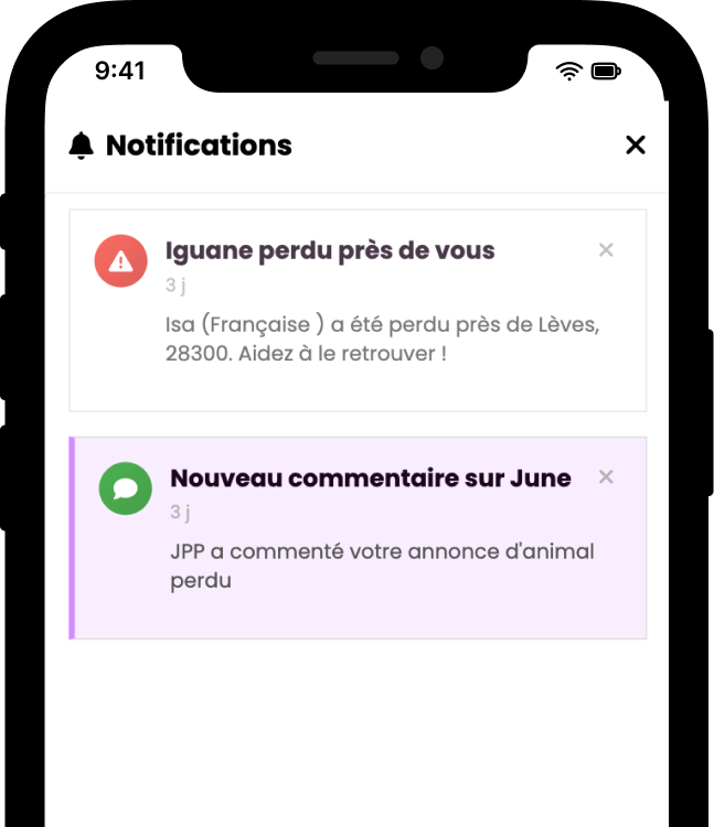 Recevez des alertes dès qu’un animal est signalé près de chez vous.